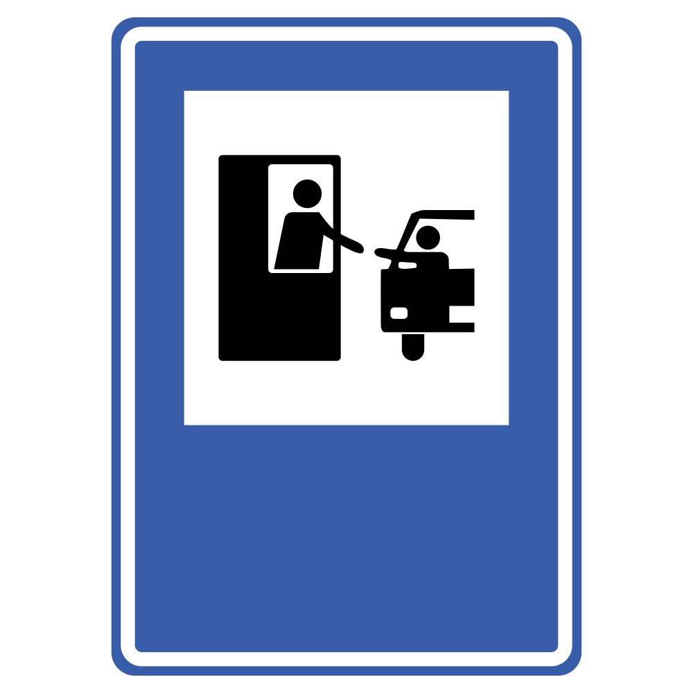 A placa de serviço auxiliar pedágio indica a presença próxima de pedágio, podendo assim, o usuário da via se programar para o pagamento e para respectiva parada.